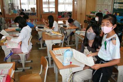 6年1組が外国語科で,英語の学習をしていました。おすすめの国を選び,そこで見られるもの(観光地)や食べられるもの,そこで買えるものなどを紹介していました。