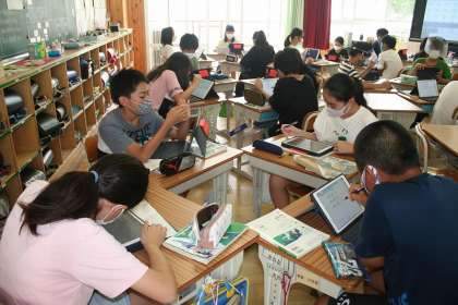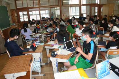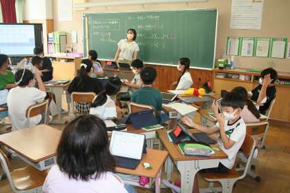 6年2組が算数で,円の面積の公式を導き出していました。円をおうぎ形にしてばらし,長方形に並べ替え,長方形の面積の公式から導き出していきます。グループで知恵を出し合えたかな。