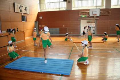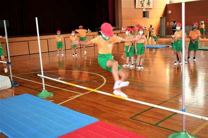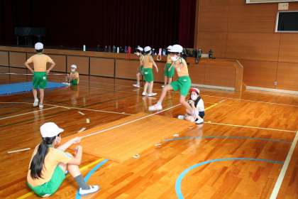 4年1組が体育で,走り高跳びの練習をしていました。本時は,リズムよく助走ができるように,5歩を「1・2・1・2・3」と声をかけながら取り組んでいました。