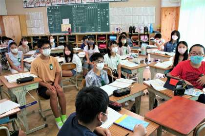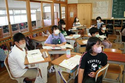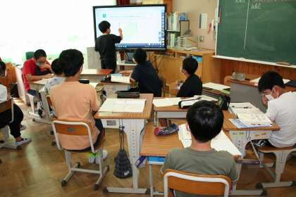 6年3組が算数で,円の面積を求める応用問題に取り組んでいました。グループで考え,代表の子が発表していました。