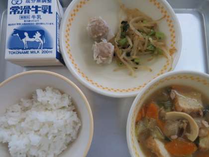今日の献立は,ご飯,シュウマイ2個,生揚げの中華煮,もやしナムル,牛乳でした。今日も美味しくいただきました。