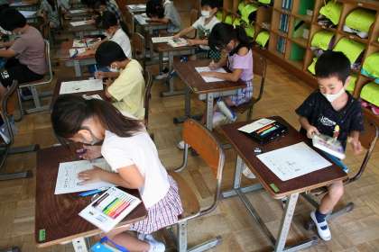 1ねん2くみが,しゃぼんだまについて,はっけんカードにかいていました。はやくできたこから,カタカナの「ス」のじのれんしゅうをしていました