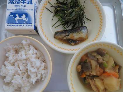今日の献立は,麦ご飯,鰯の梅煮,肉じゃが,小松菜のいそか和え,牛乳でした。今日も美味しくいただきました。