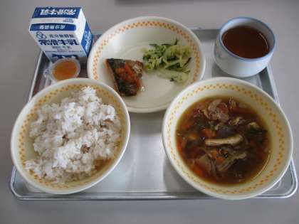 今日の献立は,麦ご飯,さばの野菜あんかけ,きゅうりとたくあんのごまあえ,沢煮椀,一口みかんゼリー,牛乳でした。今日も美味しくいただきました。