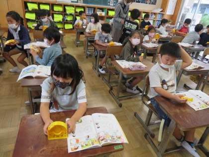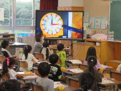 1年1組では,算数の時間に「とけい」の学習をしていました。算数セットの時計を使って,時刻を合わせていました。先生からは,「3時ってこれでいい?」と聞かれると「ダメ,長い針と短い針が反対」と素早く答えていました。