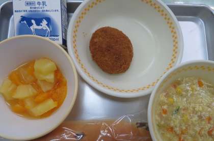 今日の献立は,レーズンロールパン,キャベツ入りメンチカツ,コーン玉子スープ,アップルポンチ,牛乳でした。今日も美味しくいただきました。