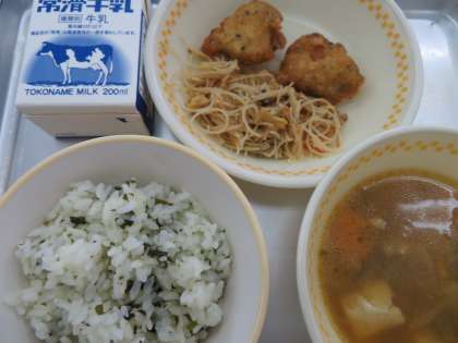 今日の献立は,わかめご飯,アジフリッター2個,焼きビーフン,ピリ辛汁,牛乳でした。今日も美味しくいただきました。