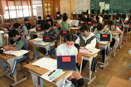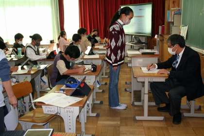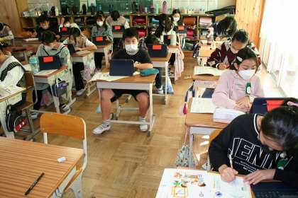 6年3組が書写のレッツ・トライのページで,年賀状の書き方を練習していました。「あけまして おめでとう ございます」の配列に気をつけて書いていました。