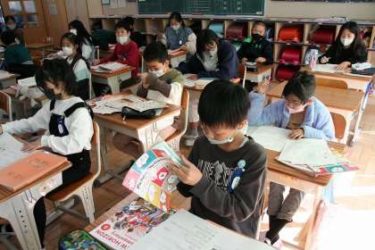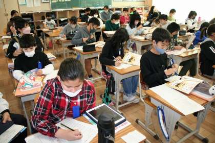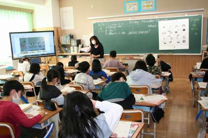 5年1組が外国語科で,英語での道案内について勉強していました。Excuse me. Yes?. Where is the police station? のように続いていきます。