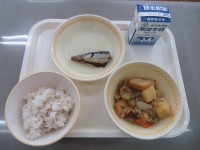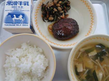 今日の献立は,ご飯,照り焼きハンバーグ,ひじきと大豆の炒め煮,豆腐と湯葉のすまし汁,牛乳でした。今日も美味しくいただきました。