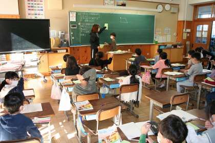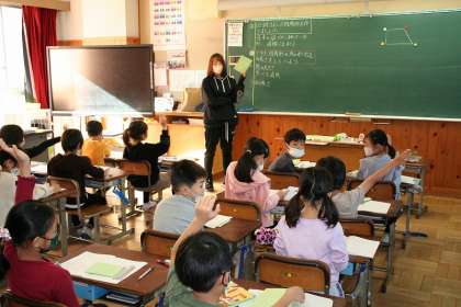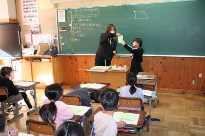 2年2組が算数で,初めて長方形を勉強しました。四角形,直角を勉強し,次が長方形でした。紙を実際に折って,長方形を作っていました。