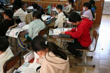 3年2組が理科で,光の進み方の実験結果をまとめていました。けつろんは,「かがみではね返した光は,まっすぐに進んでまとに当たる」です。