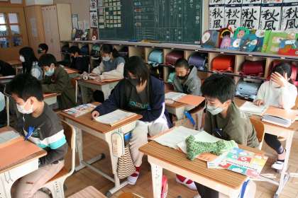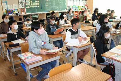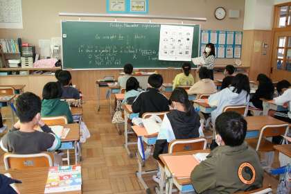 5年1組が外国語科で,英語で道案内の会話を練習していました。地図を見て,Go straight. Turn left.と大きな声で練習していました。