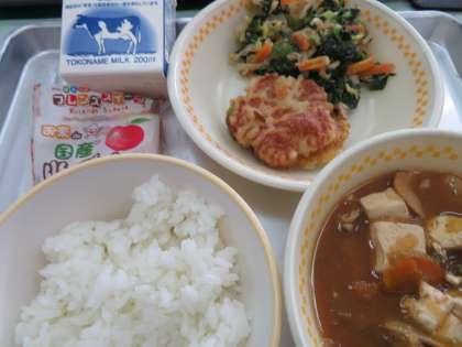 今日の献立は,ご飯,愛知県産野菜入りはんぺんのお好み揚げ,エリンギと野菜のごま酢和え,豚汁,お米のリンゴタルト,牛乳でした。今日も美味しくいただきました。