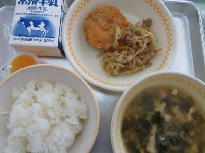 今日の献立は,ご飯,レンコンサンドフライ,切り干し大根のソース煮,実だくさん汁,一口ミカンゼリー,牛乳でした。今日も美味しくいただきました。