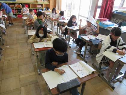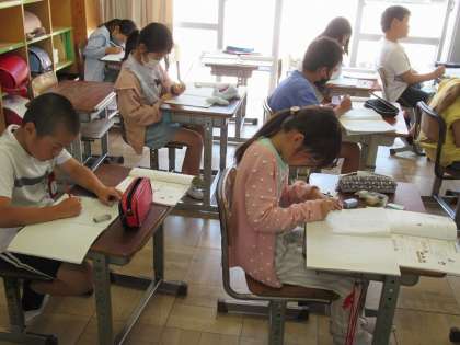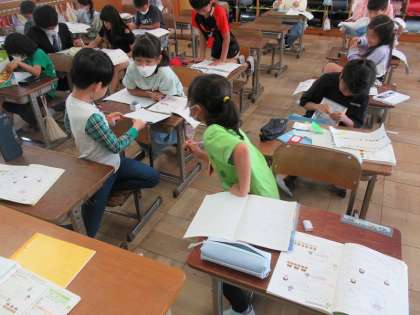 3年2組が算数で,答えが10をこえるわり算に取り組んでいました。難しい練習問題は,学び合いです。