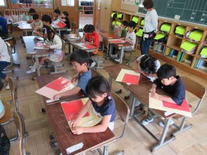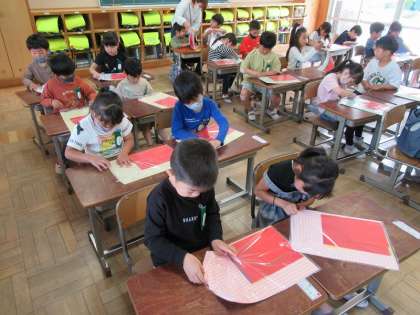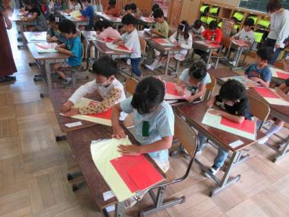 1ねん1くみがずこうで,ざいりょうをふくろからだしていました。かみをやぶいて,さくひんをつくります。