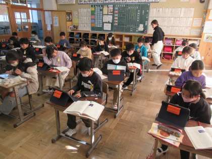 4年3組が国語で,説明文を要約していました。題材は,「うなぎのなぞを追って」です。担任の板書をヒントに取り組んでいました。