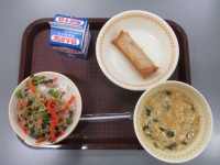 今日の献立はごはん ぎゅうにゅうはるまきビビンバちゅうかふうたまごスープ です