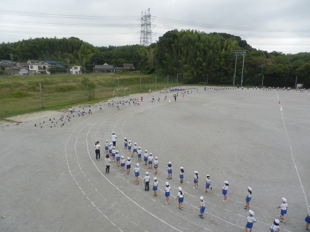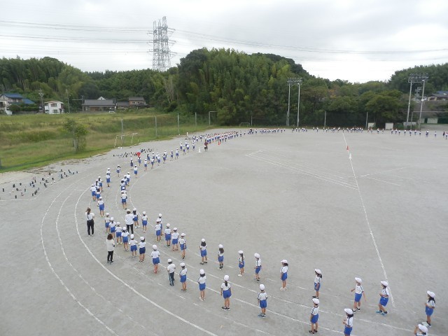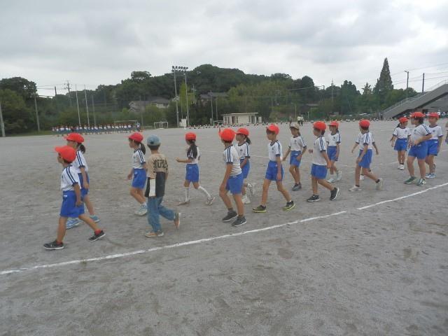 1年生から4年生が集まり、控席から入場して、自分の立ち位置を覚えました。
