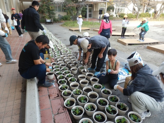 今日は、PTA花ボランティアの活動で、卒業式・入学式用の花の苗を鉢に移植しました。
