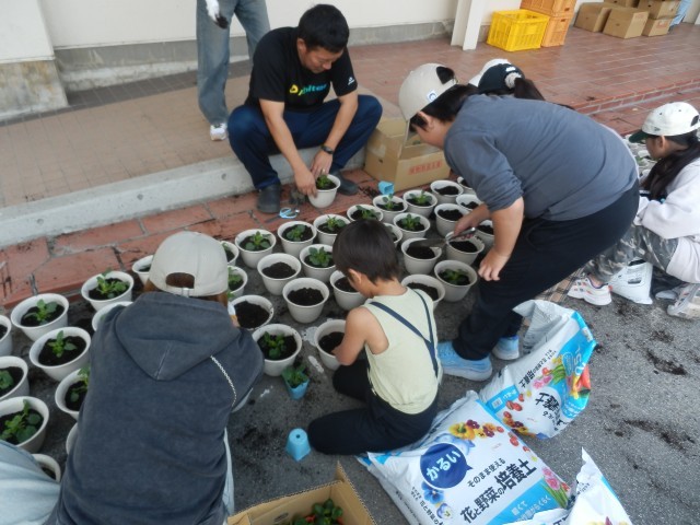 移植している様子を見た子どもたちが、「手伝いたい」と言って、鉢に土を入れてくれました。
