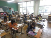 子どもたちは、2時間目の終了後、25分の休み時間を使って、グラウンドでなわとびを行います。