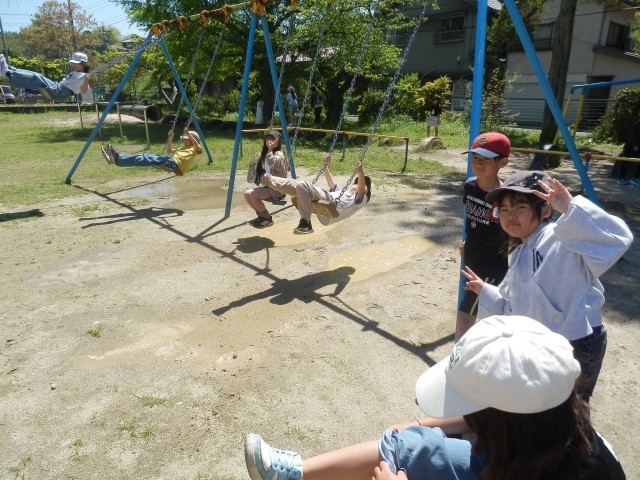 ぶらんこの下に水たまりができていましたが、気にせず、思いっきり楽しんでいました。