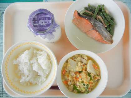 ごはん ぎゅうにゅう おやこに さけのしおやき いんげんとハムのごまあえ