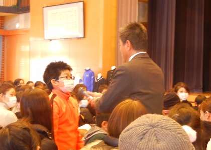 2月3日(金)13:50から知多中学校の体育館で,本校と旭北小6年生と保護者の方が集まって,入学説明会を行いました。保護者の皆様は,お子様の中学校入学の準備を進めなけばという意識と,6年生は,4月からの中学校生活への希望と期待の気持ちをもったことと思います。写真は,知多中学校長が本校6年生に質問している様子と,知多中学校教務主任から知多中学校の概要や教育課程などの話を聴いている様子です。