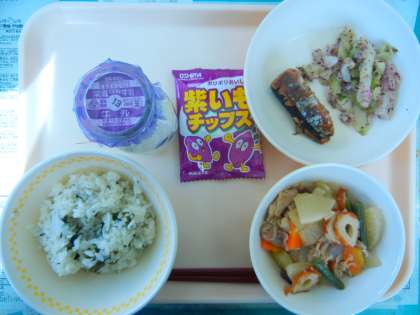 わかめごはん ぎゅうにゅう ぶたにくとだいこんのにもの さんまのおかかに キャベツのゆかりあえ さつまいもチップス