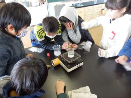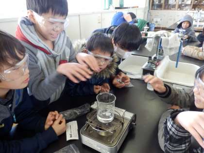 2/10 理科実験 もののとけ方 (5年生) 公開日 2017/02/10 更新日 2017/02/10 5年生 本日,理科「もののとけ方」で実験を行いました。溶けた食塩やミョウバンを取り出すために,水を蒸発させ,様子を観察しました。 児童は,身を乗り出しながら,実験に取り組むことができました。今後もいろいろなことに興味をもって,積極的に活動できるように支援していきたいです。