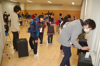 2/17 H29年度前期児童会役員選挙 投票 公開日 2017/02/18 更新日 2017/02/18 児童会・委員会 2月17日(金)にH29年度前期児童会役員選挙の投票を行いました。今回から,投票の仕方を大きく変え,より実際の選挙に近づけました。 ・演説と投票の日にちを分ける。 ・事前に投票場入場券を配り,投票する際に受付で提示する。 子どもたちは,自分の足で投票場に行き,静かに,気持ちを込めて投票を行うことができました。結果は来週の月曜日に出ます。