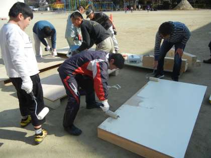 この日,おやじ隊の隊員のお父様方と教職員,児童一人で13時30分より第4回遊具製作会を行いました。児童に大人気の縄跳び練習用ジャンプ台を11台作りました。初めに,よく使って割れてしまったジャンプ台の天板を外し,新しい土台の木と天板を釘で止めました。その後,白のペンキを塗って完成させました。また子どもたちが喜んでジャンプ台を使って,縄跳びを練習することでしょう。写真は,ジャンプ台作成の様子と皆でペンキを塗っている様子です。