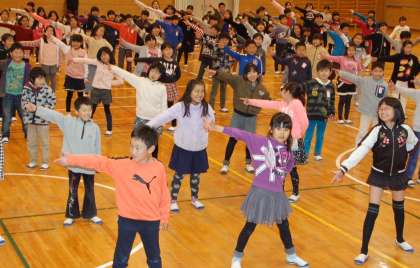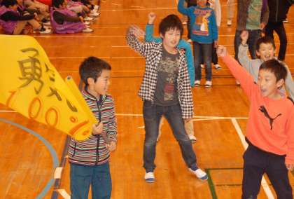 2/24 6年生を送る会(3年生) 公開日 2017/02/27 更新日 2017/02/27 全校 3年生は、元気なかけ声で入場し「勇気100%」を歌って踊りました。途中に千原君ンが旗を持って走りウェーブを行い、6年生に感謝の気持ちを伝えました。