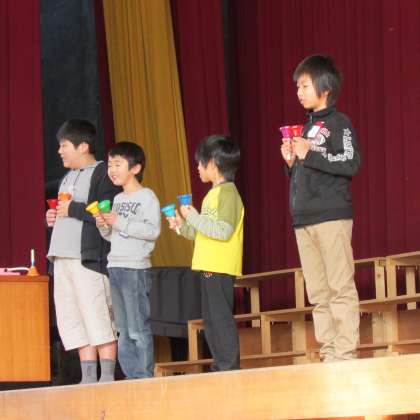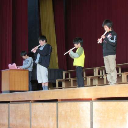 ひまわり組が2月17日(金)市勤労文化会館やまももホールでなかよし交流会を行いました。その際,当日を迎えるまで一生懸命練習してきたリコーダーと鍵盤ハーモニカの演奏やハンドベルの合奏を発表したのですが,本校全校児童の前でもぜひ聴いてもらいたいと思い,朝会が終わった後,4名で演奏をしました。演奏後,児童から盛大な拍手を受けました。写真は,左からリコーダーと鍵盤ハーモニカの演奏,右がハンドベルの合奏をしている様子です。