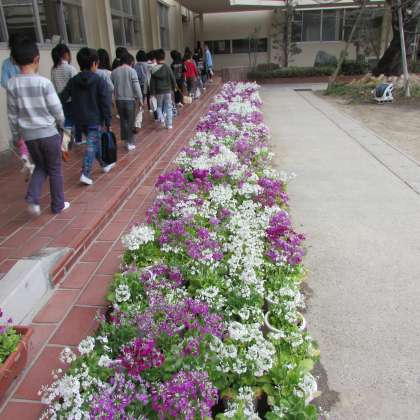 校内では,卒業式の会場を彩るサクラソウ,パンジー,黄色のスイセンが咲き誇っています。サクラソウとパンジー,ノースポールなどは,PTA環境体育部員や花ボランティアのお母さま方に移植していただいたものです。