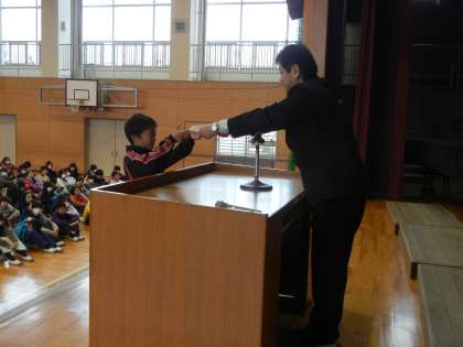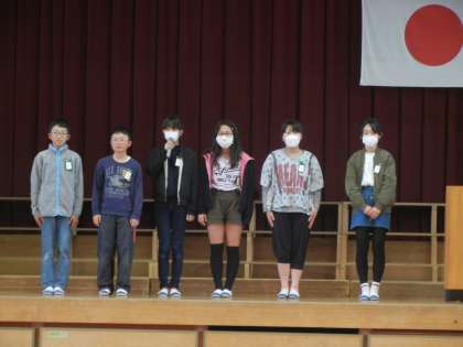 本日の朝会が,今年度最後の朝会となり,6年生にとっては岡田小学校最後の朝会となりました。そこで,校長先生より,前期・後期児童会役員を務めた6年生6人を壇上に招き,役員を務めて学んだことなど,一人一人に感想を発表してもらいました。どんどん役員に立候補してほしい,役員として学んだことを中学校でも生かしていきたいなど,素晴らしい意見を聴くことができました。最後に盛大な拍手を全校児童から受けました。次に,3年辞書引きコンテストの表彰を行いました。名人各学級1名,準名人各学級2名の計9名が選ばれ,代表で1組竹澤遥人さんが表彰状を受けました。選考基準は,時間内で早く正確に多くの言葉を辞書で調べられた児童ということだそうです。