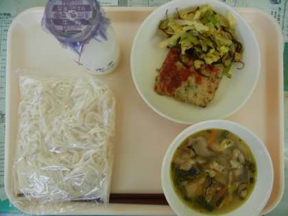ソフトめん ぎゅうにゅう さんさいじる はんぺんのてんぷら キャベツのこんぶあえ