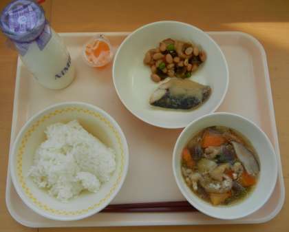 ごはん ぎゅうにゅう のっぺいじる さわらのさいきょうやき ごもくにまめ ひとくちみかんゼリー