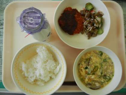 ごはん ぎゅうにゅう かきたまじる みそカツ ふきのあまずあえ