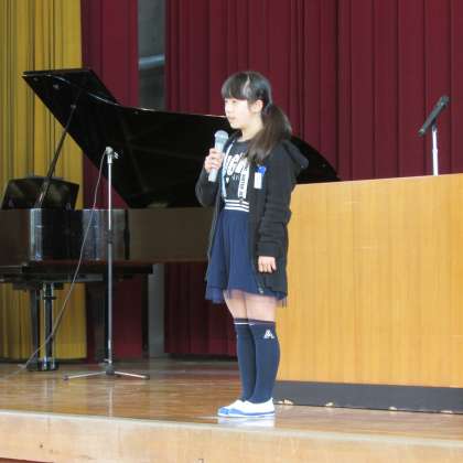 次の写真は,左から3年代表山崎彩夏さん,4年代表手塚祐衣さん,5年代表竹内剣真さんが発表している様子です。発表が終わった後,校歌を全員で大きな声で歌って式を終えました。