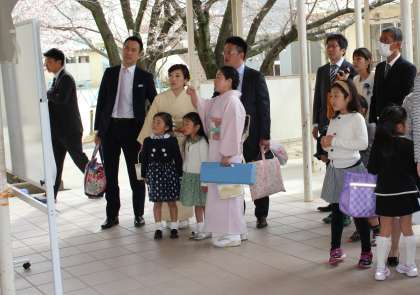 4/6 入学式 公開日 2017/04/06 更新日 2017/04/06 全校 4月6日(木)花曇りの中、桜もようやく満開になり、入学式が行われました。中央昇降口で名前を確認して、受付では6年生が胸に花をつけてくれました。