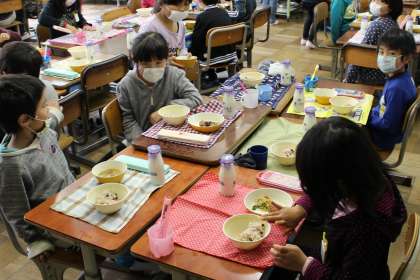 今日から、いよいよ給食が始まります。4月のスタートなので赤飯でした。ゼリーもついていました。1学年あがった学年なので、今までより配膳もスムーズにできました。待っている時も静かにマスクをつけて、待てていました。給食をいっぱい食べて「ぺろり」(完食)をめざしましょう。