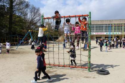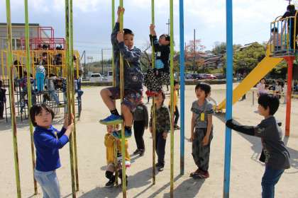 2年生が1年生の児童に,校庭の遊具の正しい使い方を教えてくれました。