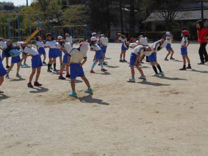 3年2組の体育の授業の様子です。整列の仕方や準備運動を学んでいます。