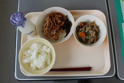 ごはん ぎゅうにゅう にくどうふ れんこんチップス わくわかめのつくだに