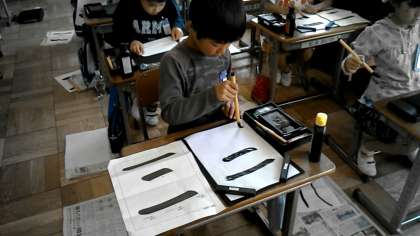 3年1組の書写の授業です。漢字の『 一 二 』を書いています。