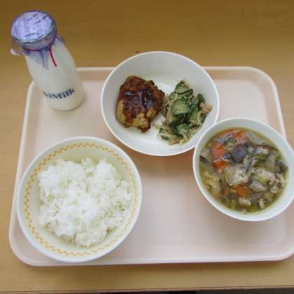 ごはん ぎゅうにゅう のっぺいじる けんちんしのだのにくみそかけ きゅうりとツナのごまあえ