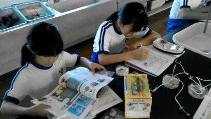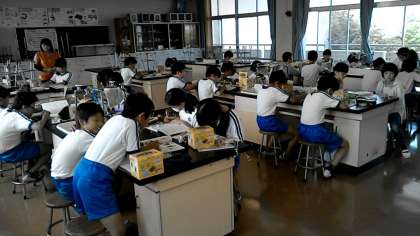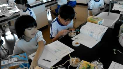 5年2組の理科の授業の様子です。インゲン豆やトウモロコシの発芽の条件を調べる実験をしています。
